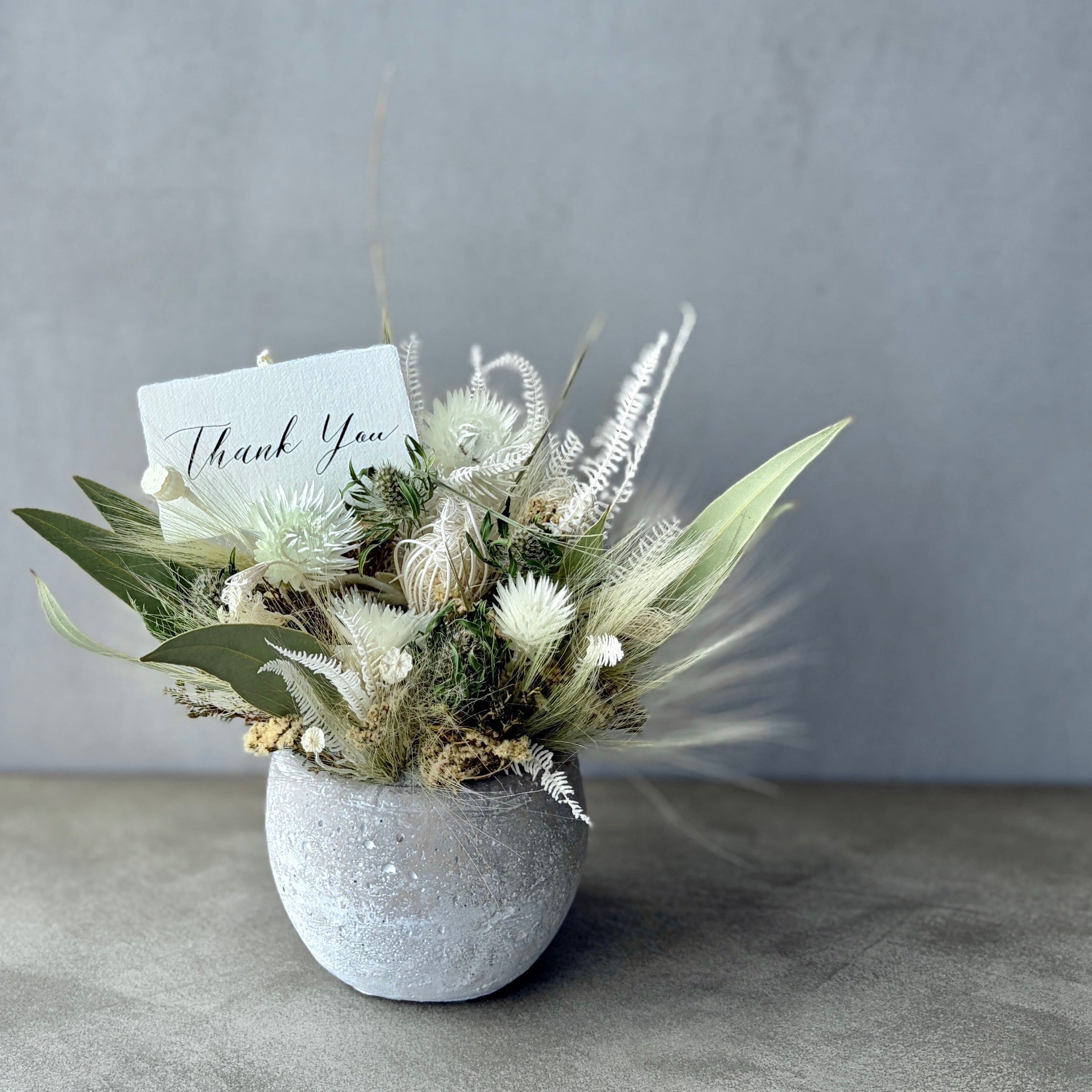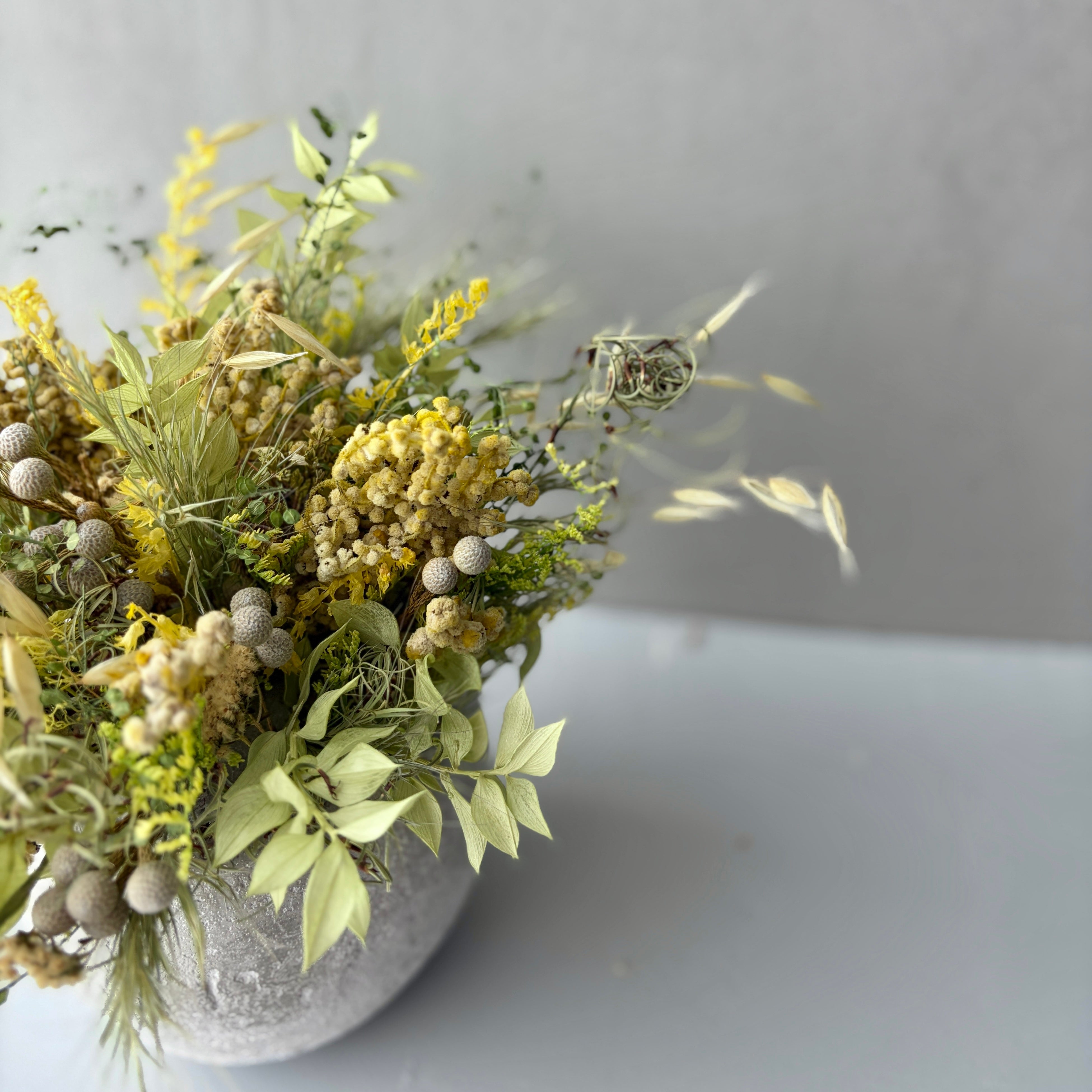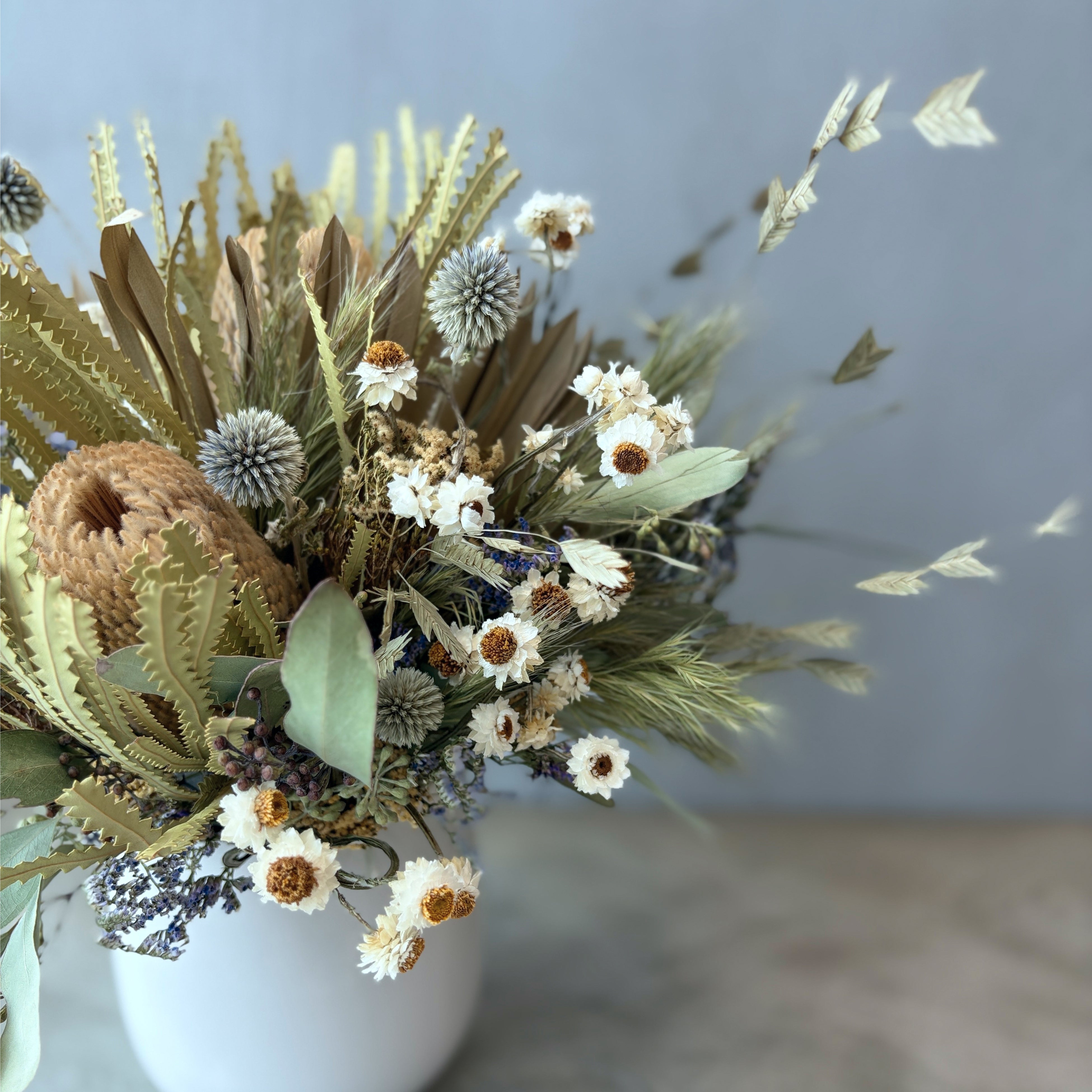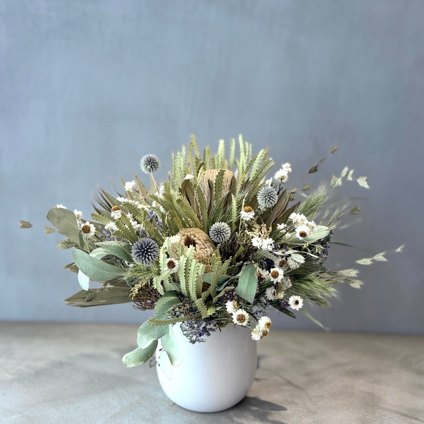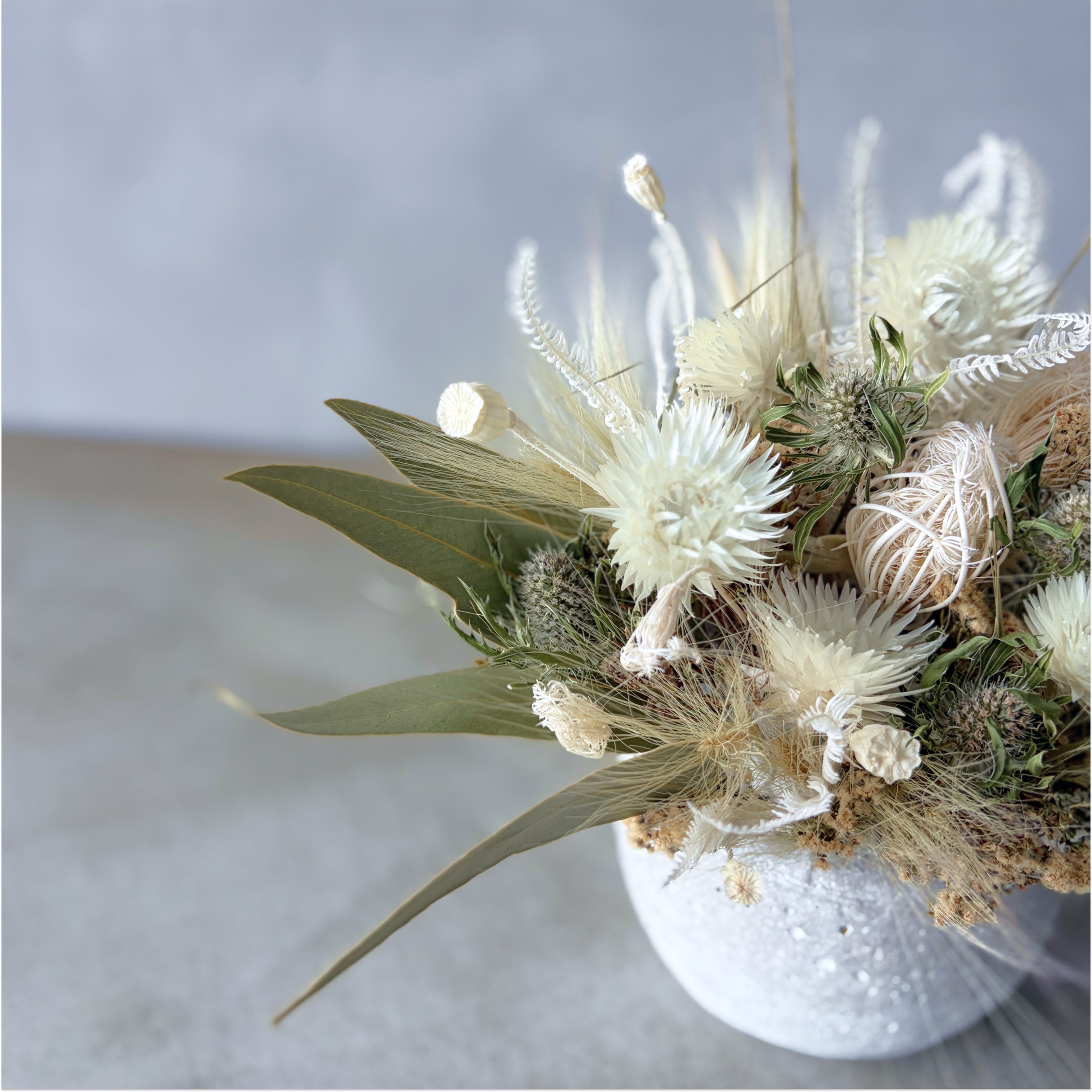 バンクシアや瑠璃玉アザミ、パームフラワーなど個性豊かな花々をワイルドオーツやアンモビューム等のやさしい草花でまとめました。お部屋のアクセントとして、空間を彩ります。