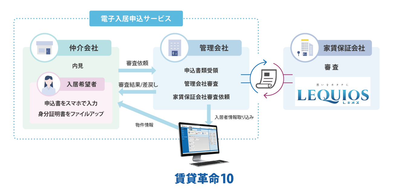電子入居申込サービスは、日本情報クリエイトが不動産会社に向けて提供する無料のサービスであり、導入することで入居申込のやり取りのほとんどをオンラインで完結させることができます。また、クラウド型の賃貸物件総合管理システム「賃貸革命10」と一緒にご利用いただくことで、物件情報や入居者情報等の共通のデータが連携し、作業担当者はより広い範囲での業務効率化が実現します。