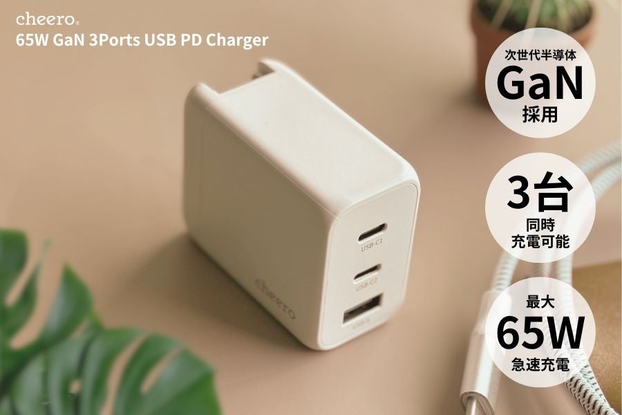 cheero(会社名:ティ・アール・エイ株式会社)は12月12日(火)正午より、「cheero 65W GaN 3 ports USB PD Charger」を発売開始します。