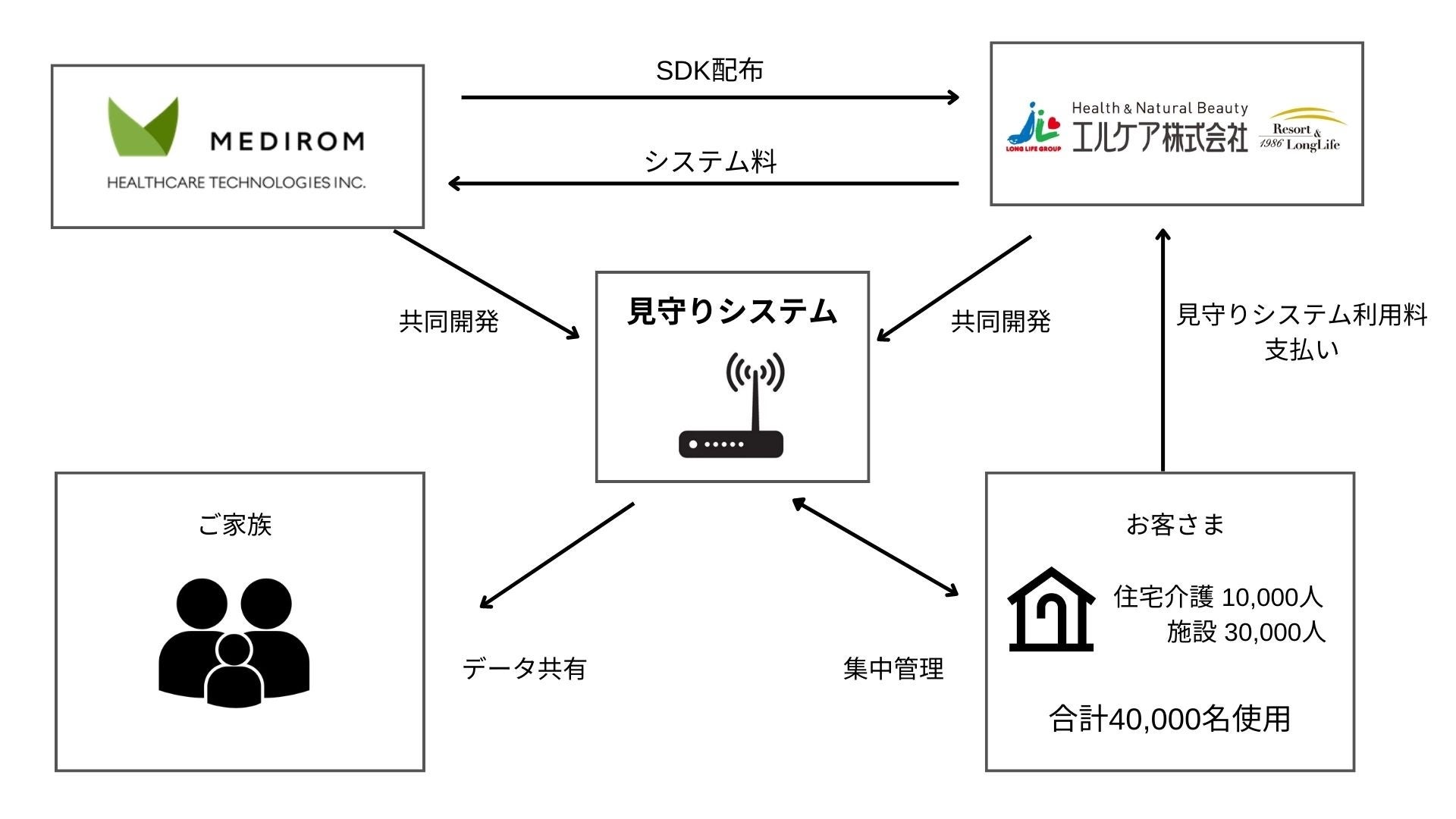 今回の事業提携により、当社のSDK(Software Development Kit =ソフトウェア開発キット)を配布し、介護サービス事業に特化した見守り(集中管理)システムを共同開発いたします。