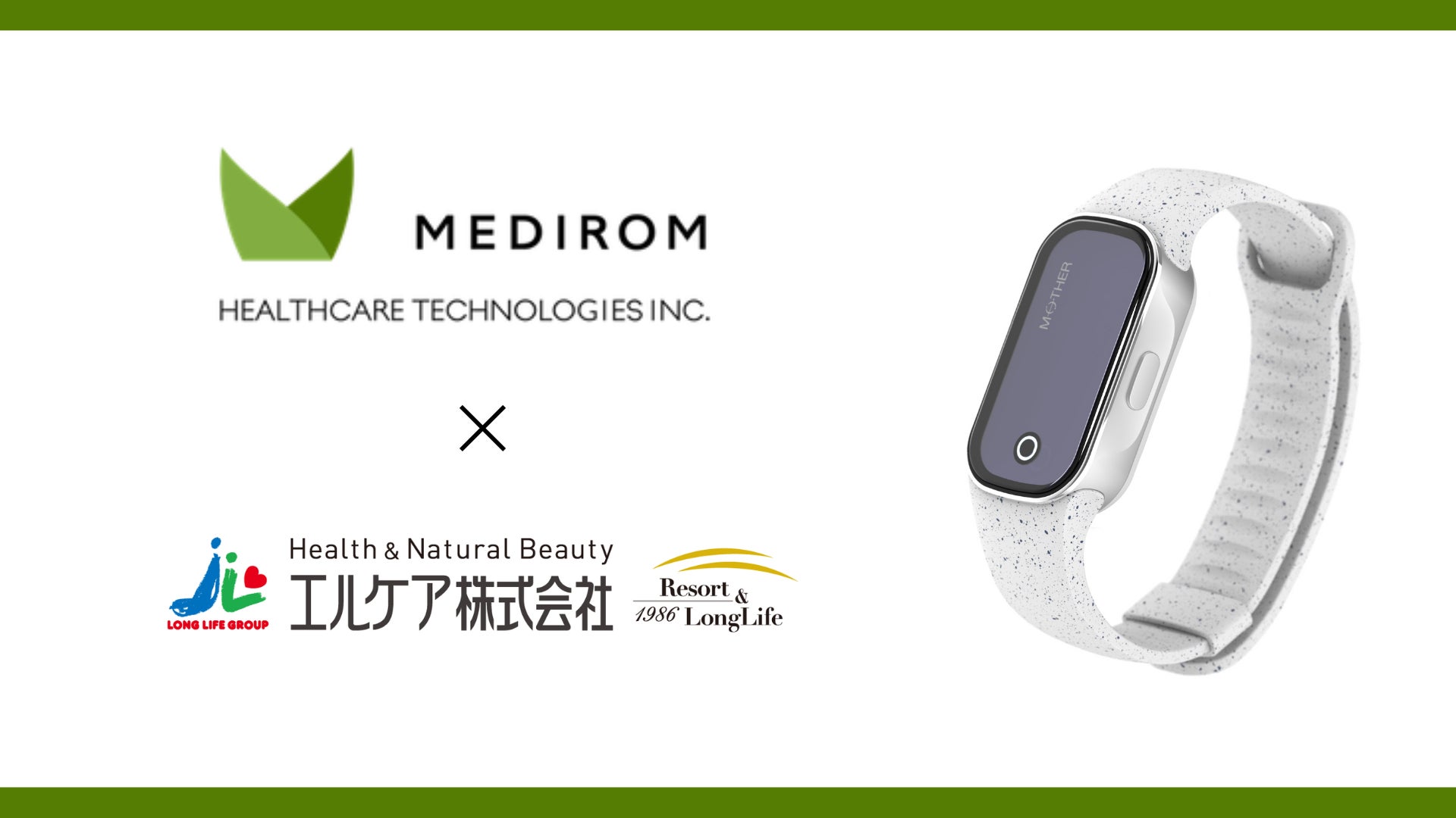 2022年9月1日、ヘルステック事業を展開する株式会社メディロム(本社:東京都港区、代表取締役:江口 康二、米国Nasdaq上場 NASDAQ: MRM 以下「メディロム」)と介護サービス事業を展開するロングライフホールディング株式会社(本社:大阪府大阪市北区、代表取締役社長:桜井(小嶋)ひろみ)の子会社である10種類のケアサービスを提供する総合在宅介護サービス事業のエルケア株式会社(本社:大阪府大阪市北区、代表取締役社長:宇野元博、以下、「エルケア」)は、「事業提携に関する基本合意書」を締結し、メディロムが開発した24時間365日充電不要の活動量計「MOTHER Bracelet™」を用いた見守り(集中管理)システムを共同開発することに合意しました。
