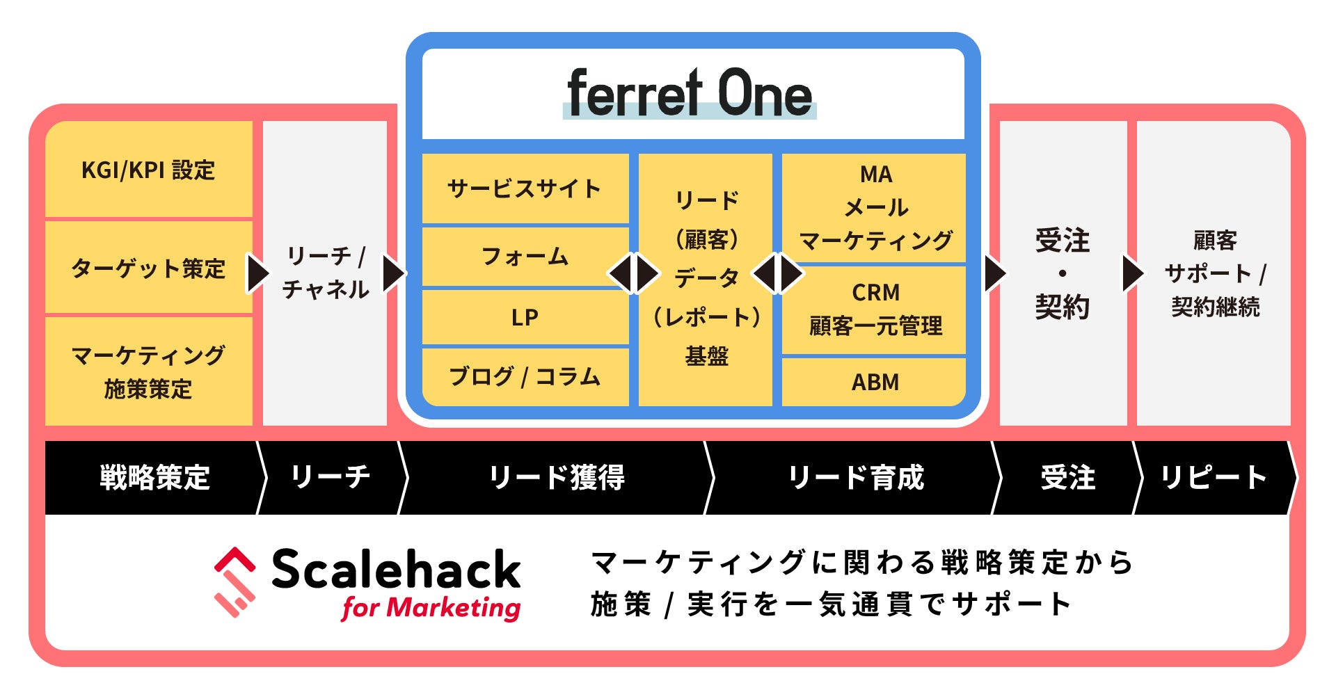 このような背景があり、ワンストップでBtoBマーケティングにおける必要な環境構築ができる『ferret One』と、Scalehackのプロフェッショナル人材によるハンズオン支援を組み合わせ、BtoBマーケティングを総合支援するオールインワンソリューションを提供すべく、業務提携を締結することとなりました。