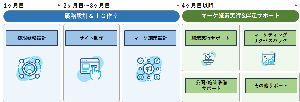 BtoBマーケティングをワンストップで実現するツールの提供に加え、クライアント組織内のマーケティング担当者として戦略策定から実行、体制構築までを一気通貫で支援