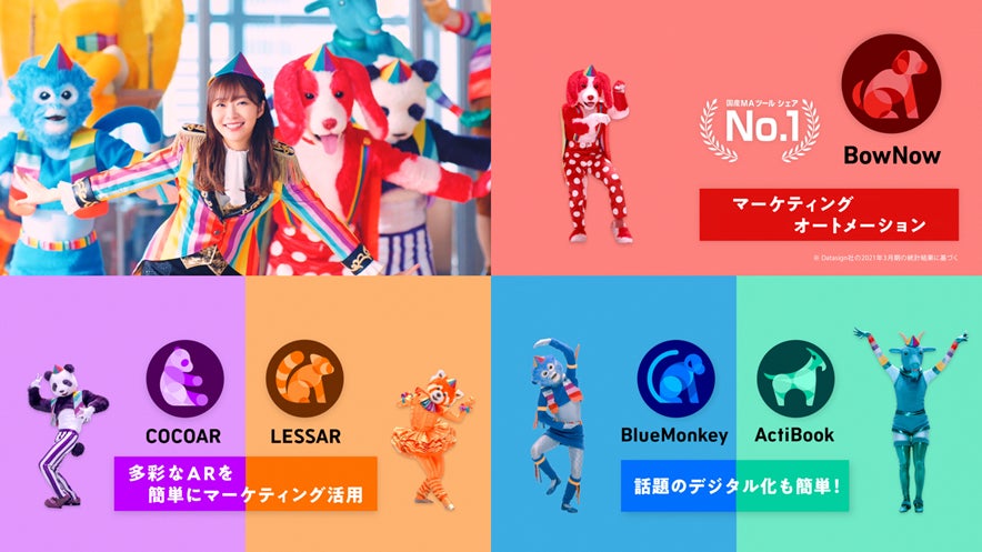 『Cloud CIRCUS』 のCMは、2020年11月に放映開始し、CMキャラクターは、切れ味鋭い視点とわかりやすい発言や、タレント活動の枠を超えたプロデュース活動など多角的な活躍をされ、多くの方から愛されている指原莉乃さんを起用しています。今回公開する第5弾では、MAツール『BowNow(バウナウ)』篇、AR制作ツール『COCOAR(ココアル)』・『LESSAR(レッサー)』篇、WEBサイト運用ツール『BlueMonkey(ブルーモンキー)』・電子ブック作成ツール『ActiBook(アクティブック)』篇の3パターンで、サーカス団の団長に扮した指原莉乃さんと各ツールのアイコンとなる 動物達が耳に残る歌とユニークなダンスでツールの特徴を紹介します。
