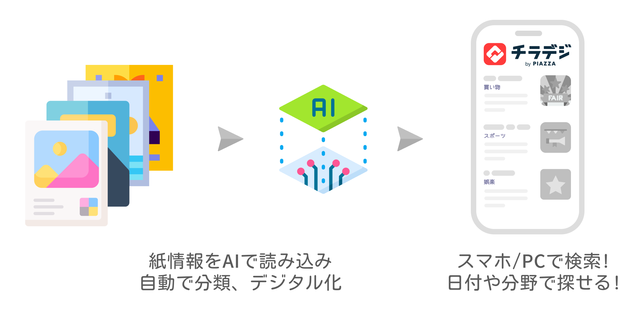「チラデジ」は、テクノロジーを駆使した次世代の街づくりを支援するPIAZZAが開発した、紙媒体での情報をデジタルデータに変換できるDXサービスです。