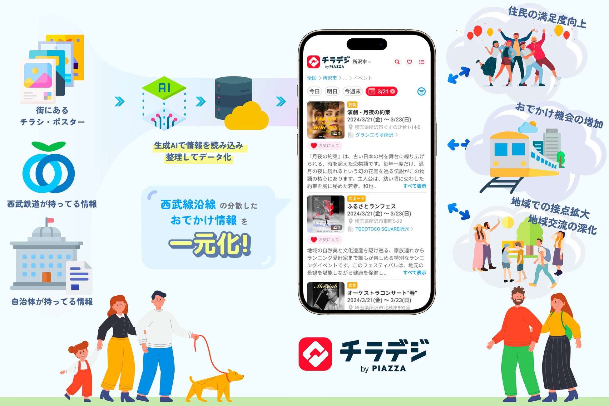 西武鉄道は、沿線自治体や企業、大学、地域の方々と連携・共創し、沿線地域の魅力を深堀り・再発見して、沿線内外に広く発信していくことで、地域住民に愛され、長く住み続けていただける沿線としての価値の創造を目指しています。そこで、地域に根差した行事・イベント情報が一元化されるプラットフォームによって、今まで接点のなかったイベント主催者・参加者双方をつなぎ、地域イベントに参加する機会を増やし、地域イベントを活性化させることで、地域での接点を創出し、人と人との交流を通じた地域・沿線への愛着を醸成したいという想いから、PIAZZAと協働で、沿線に分散している地域のおでかけ・イベント情報を「チラデジ」によって一元化し、発信していきます。