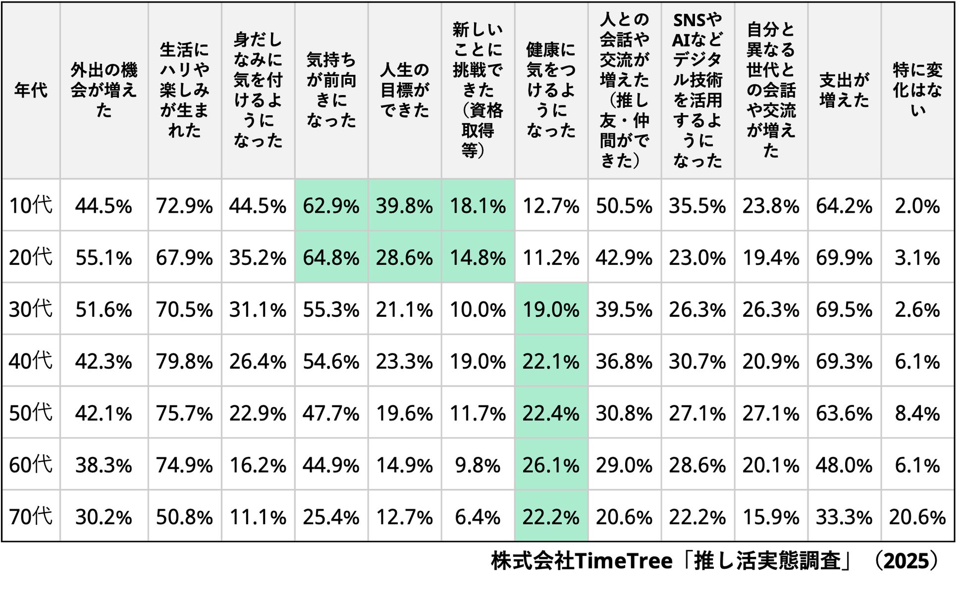 推し活による変化、「生活にハリや楽しみが生まれた」が全世代で最多。シニア層では健康面への影響も