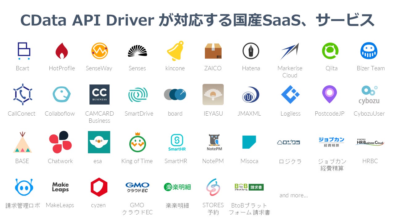 CData では、汎用のCData API Driver で使える事前定義されたコネクタProfiles を180種類以上提供しています。今回、新たに以下の国内有力SaaS のAPI に対応しました