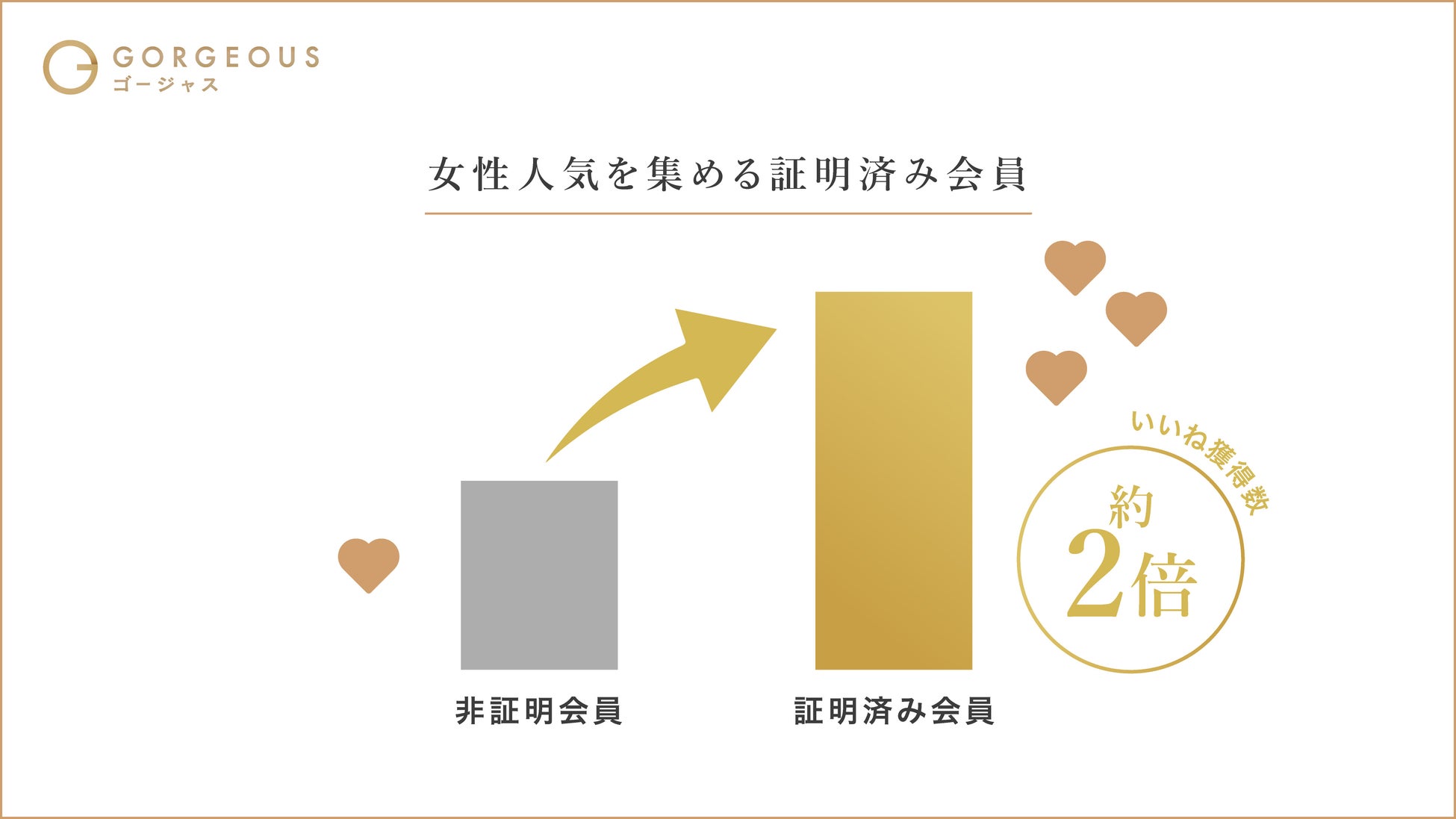 実際にゴージャスにおける職業証明済み会員は、証明を行っていない会員と比較し約2倍の人気(いいね)を集めています。