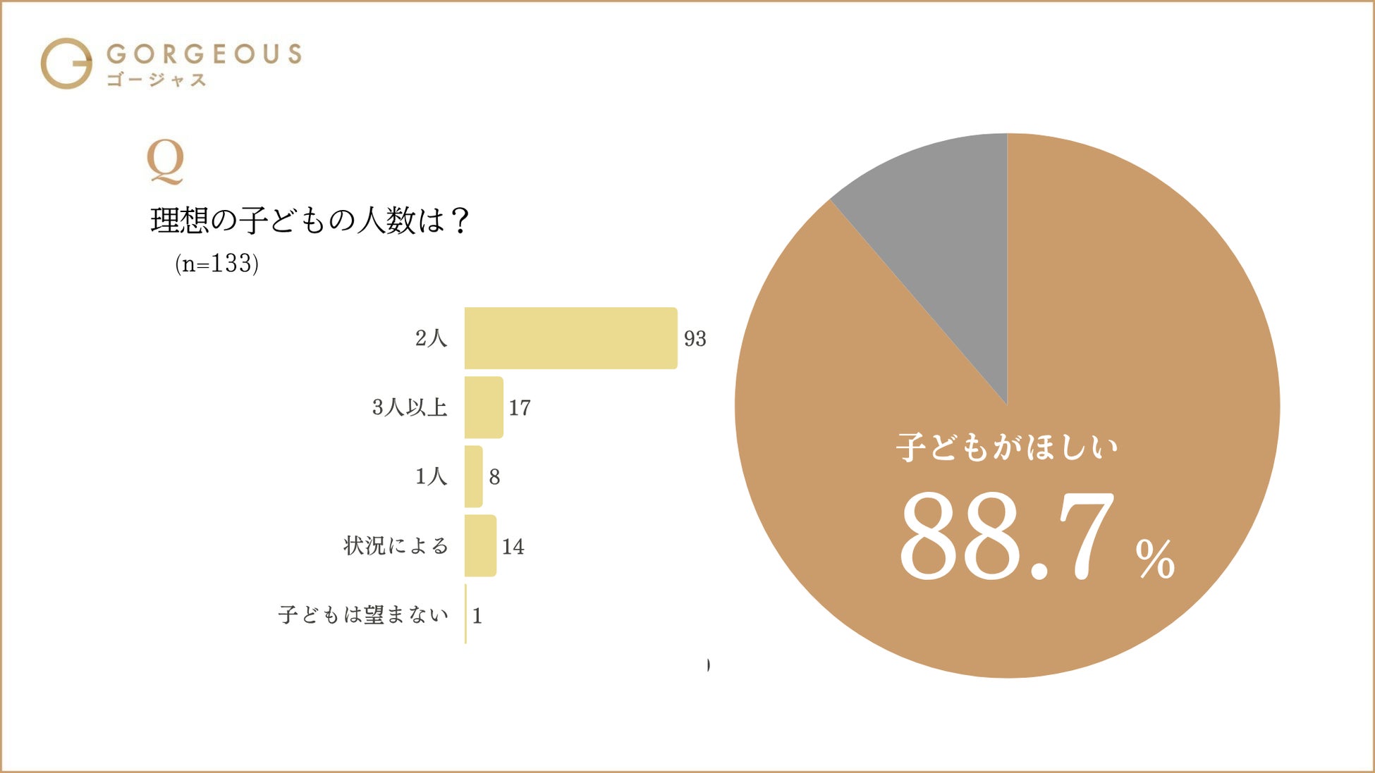 また、88.7%が「子どもを望む」と回答し、理想の子どもの人数として82.7%が「2人以上」を希望していることから、「結婚=家族を持つこと」として真剣に捉えている姿勢がうかがえます。一般的な若年層に比べても、恋愛・結婚・出産に対する意欲は非常に高い傾向が見られました。