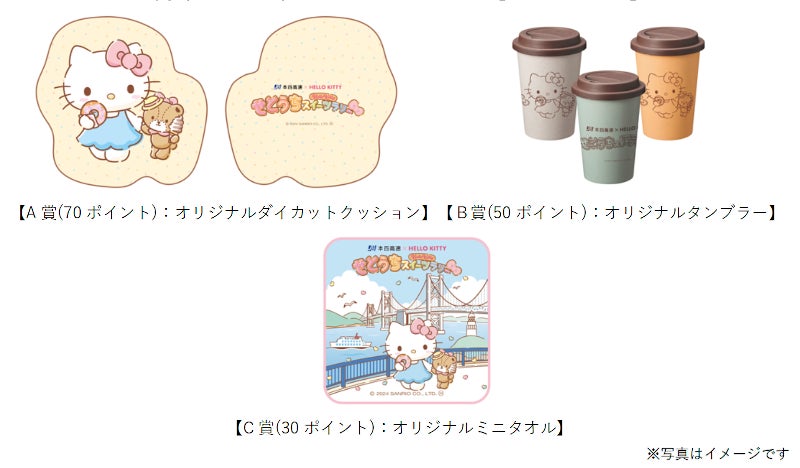 今回のデジタルポイントラリーでは、多くの方に瀬戸内の魅力に注目いただくため、幅広い層に人気のある株式会社サンリオのキャラクター「HELLO KITTY」とタイアップします。50周年の節目を迎えたHELLO KITTYと本四高速のコラボ限定描き下ろしイラストがポスターなどで展開し、景品として本イベント限定のHELLO KITTYオリジナルグッズもご用意しています。