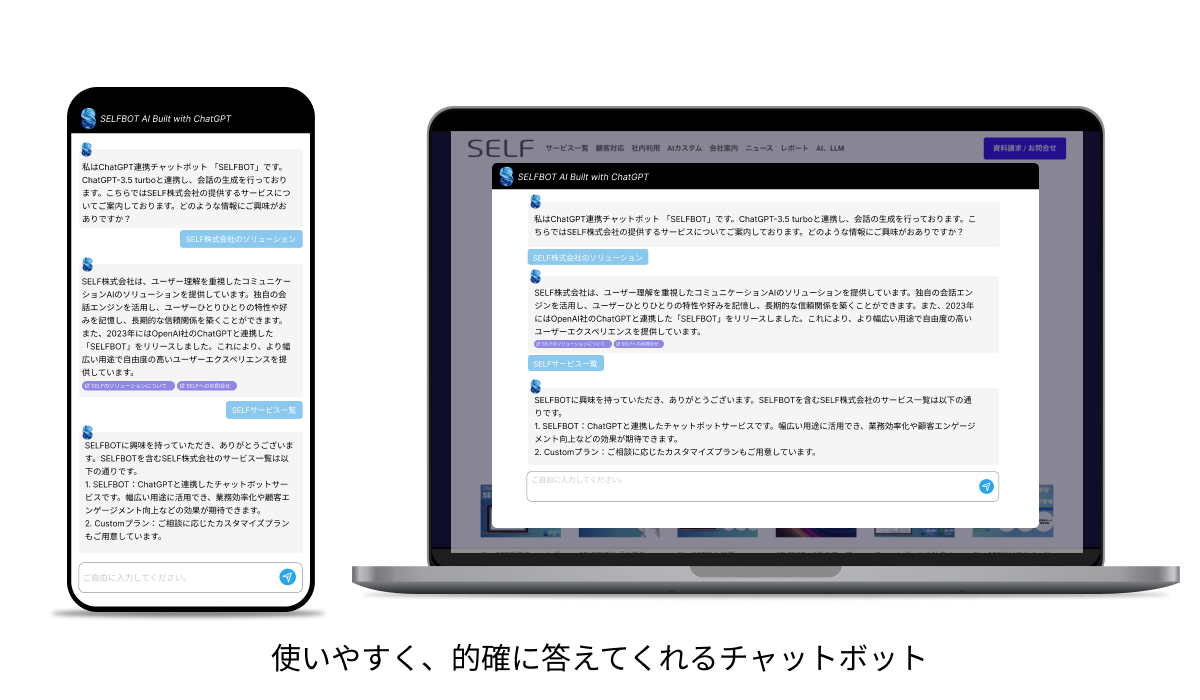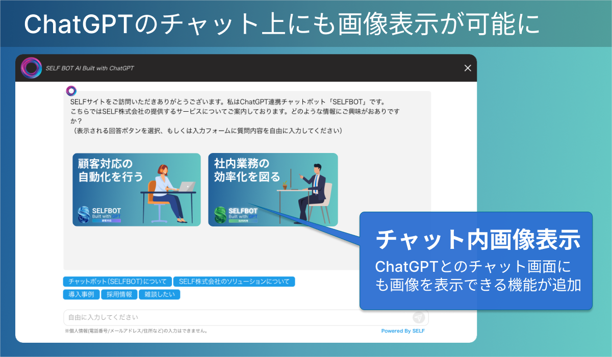 ChatGPT連携学習型チャットボットとして、お問合せ対応削減やカスタマーサポート、または社内のドキュメント活用などのニーズをいただいている“SELFBOT”に、ChatGPT連携チャットボットにおいても、チャット上で画像表示できる機能が追加されました。