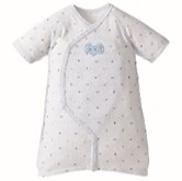 新生児の着替えは大変です。ばたばた動く赤ちゃんをあやしながら、短肌着を着せて、ドレスオールを着せて、と重ね着をさせるのは手間と時間を要します。そこで「赤ちゃんのお着替えの手間を少しでも軽減できないか」というママ・パパの声に応えるため、肌着とドレスオールを一体にした、簡単時短に着替えができるよう工夫した商品を開発しました。ドレスとしても、足部分が分かれたプレオールとしても使えます。