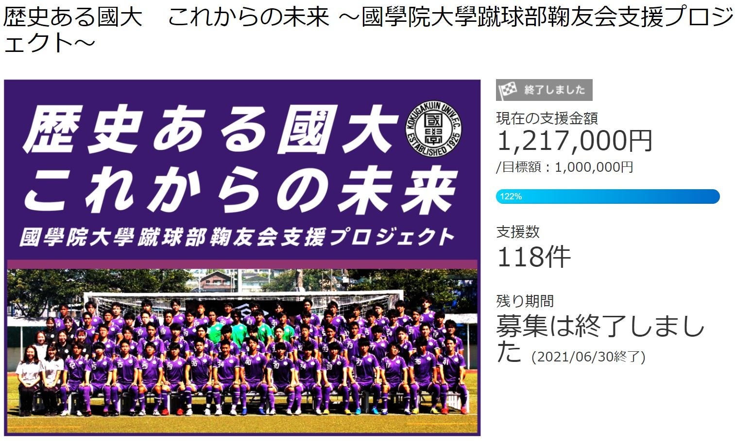 4月17日に開始した『歴史ある國大 これからの未来 ~國學院大學蹴球部鞠友会支援プロジェクト~』は、最終的には目標金額である100万円を達成し、支援数118件、支援金額121.7万円で終了いたしました。皆様には、多大なる温かいご支援をいただきましたこと、深く御礼を申し上げます。