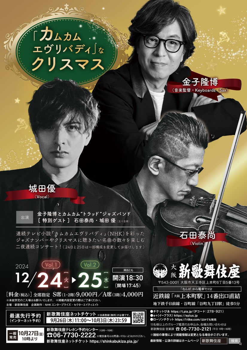 金子率いるトップミュージシャン「カムカム"トラッド"ジャズバンド」に、ドラマでナレーションを担当した俳優・歌手として大活躍の城田優と、いま最もチケットの入手が困難と言われているヴァイオリニストのひとり・石田泰尚をゲストに迎え、新歌舞伎座だけの特別ステージをお届けします。