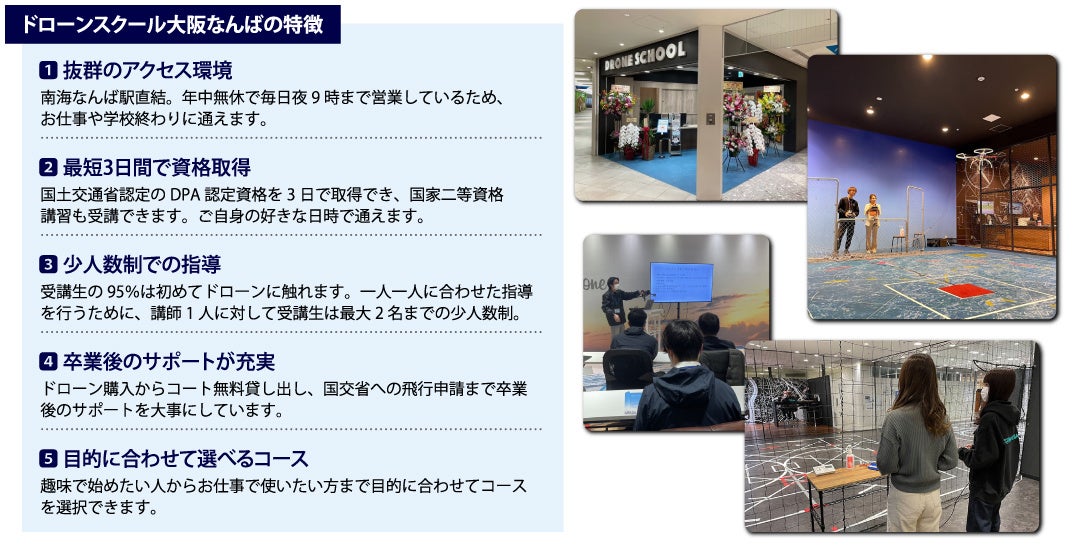 ドローンスクール大阪なんばは、大阪では初となる常設型のドローン練習コートを有した駅直結の商業施設内のドローンスクールです。3年連続受講生数No.1のドローンスクールである「ドローンスクール東京」の提携校で、国土交通省登録講習機関及び管理団体DPA(ドローン操縦士協会)認定校のため、ドローン操縦士回転翼3級を最短3日で取得でき、国家二等資格講習も受講可能です。