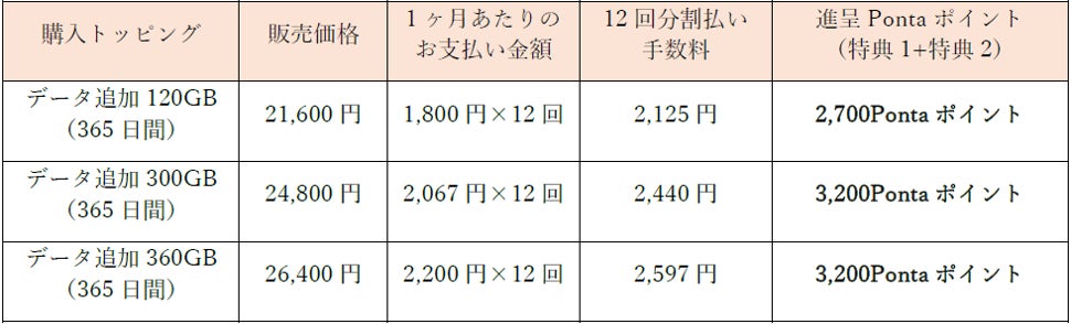 povo2.0のトッピング購入金額に応じて以下のポイントをプレゼントします。 購入金額 合計19,800円以上23,980円未満 ・・・・2,500Pontaポイント 購入金額 合計23,980円以上 ・・・・3,000Pontaポイント ※特典は、Pontaポイントとして2025年9月末日頃に加算します。 ※特典2の重複獲得はできません。 |
