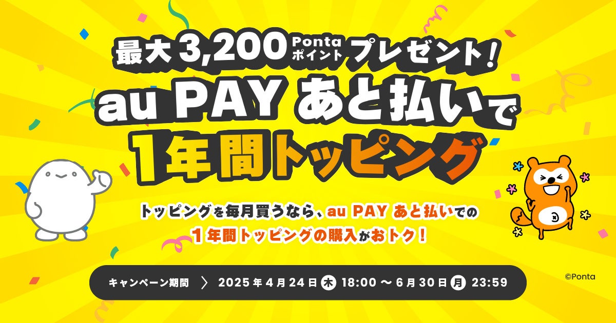 KDDI、沖縄セルラー、auフィナンシャルサービスは、2025年4月24日から、スマートフォンから簡単に申し込みができるバーチャルカード型の決済サービス「au PAY あと払い」に新規入会し、au PAY あと払いでpovo2.0のトッピングを購入すると最大3,200Pontaポイントをプレゼントする「au PAY あと払い新規入会×povo2.0トッピング購入キャンペーン!」(以下 本キャンペーン)を実施します。