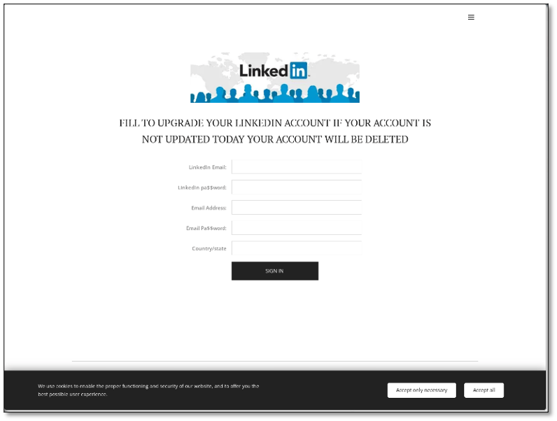 下記の例は、ウェブメールのアドレスから送信されていますが、「LinkedIn Security (mlayanac@armada.mil[.]ec)」から送信されたかのように偽装されています。このメールの件名には「LinkedIn Notice!!!(LinkedInからの通知!!!)」と記載されており、本文ではLinkedInアカウントのバージョンアップという名目で不正なリンクをクリックさせようとしています(画像1参照)。このリンクをクリックすると、「https://lin882[.]webnode[.]page/」というURLに誘導され、LinkedInのアカウント情報を入力するよう要求されます(画像2参照)。