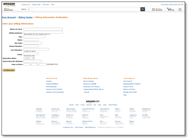 オンラインショッピングの需要が続く中、AmazonはDHLに続き4位にランクインしました。このフィッシングメールは、ユーザーの請求情報を盗み出そうとするものです。このメール(画像7参照)は、「Amazon (fcarvache@puertoesmeraldas[.]gob[.]ec)」というアドレスから送信され、件名には「Your amazon account verification(お客様のamazonアカウントの確認)」と記載されています。この件名と本文は、被害者に悪意あるリンクをクリックさせ(https://main[.]d1eoejahlrcxb[.]amplifyapp[.]com)、請求情報の入力を求める不正なページへ転送するものです(画像8参照)。