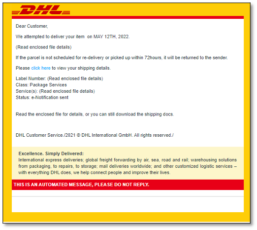 オンラインショッピングのトレンドが加速する中、第2四半期のフィッシング詐欺全体のうち12%を運送会社DHLへのなりすましが占めたことも驚くに値しません。今回のレポートでは、「Incoming Shipment Notification(配送のお知らせ)」という件名で、消費者に悪意あるリンクをクリックさせようとするフィッシング詐欺の具体例にも言及しています。
