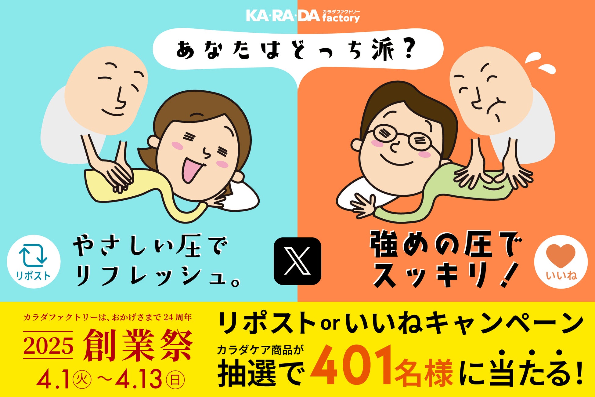 整体×骨盤サロン「カ・ラ・ダ ファクトリー」(以下 カラダファクトリー)を展開する株式会社ファクトリージャパングループ(本社:東京都千代田区、代表取締役社長:髙橋 健介、以下 ファクトリージャパン)は、2025年4月1日(火)より、カラダファクトリー創業祭2025『あなたはどっち派?リポストorいいねキャンペーン』を開催いたします。