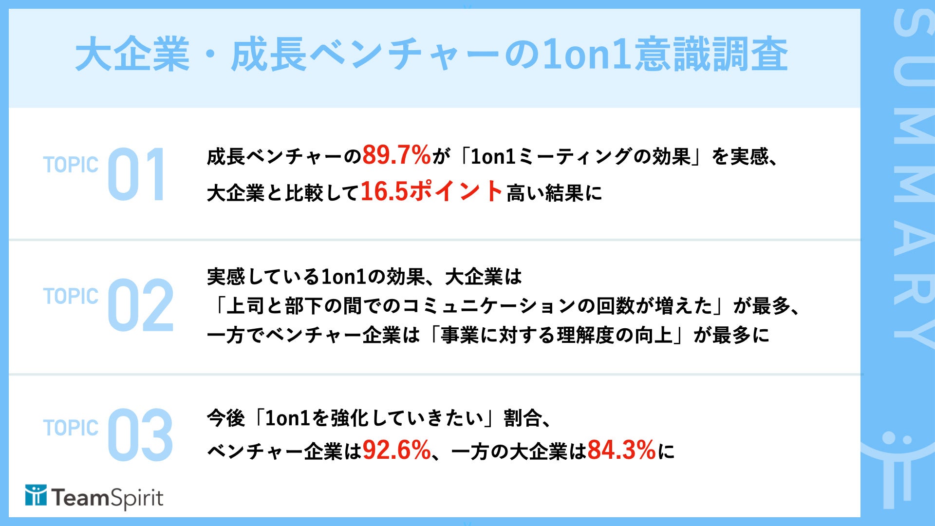 - ②成長ベンチャーの89.7%が「1on1ミーティングの効果」を実感、大企業と比較して16.5ポイント高い結果に