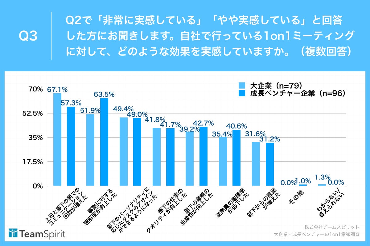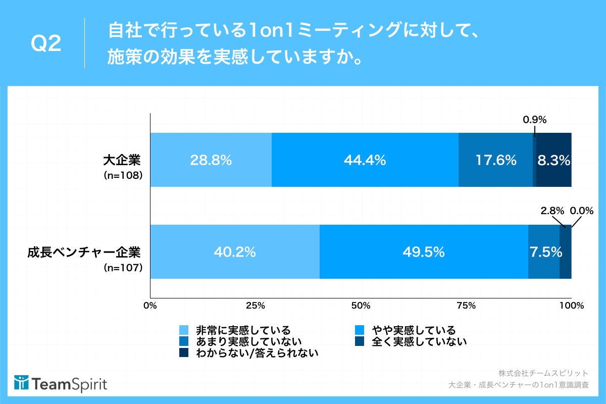 【大企業と成長ベンチャーの1on1ミーティングを比較調査】大企業より成長ベンチャーの方が「1on1の効果を実感している」割合が16.5ポイント高い結果に