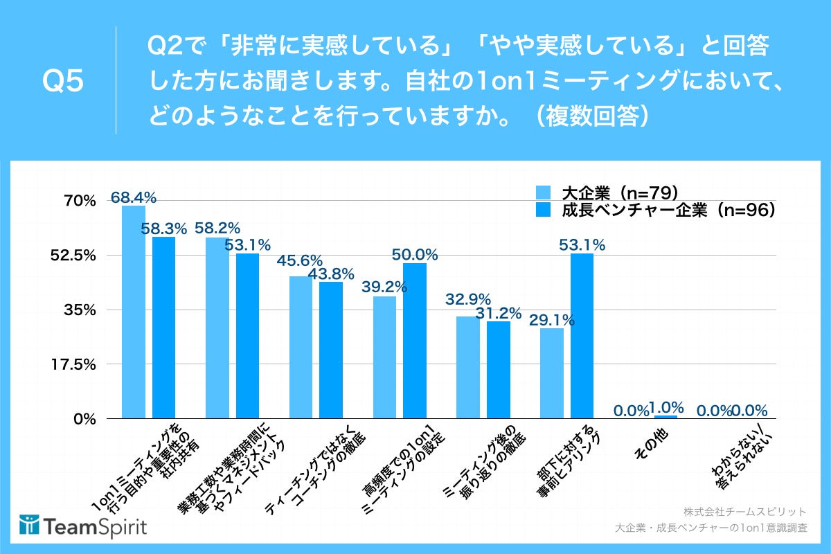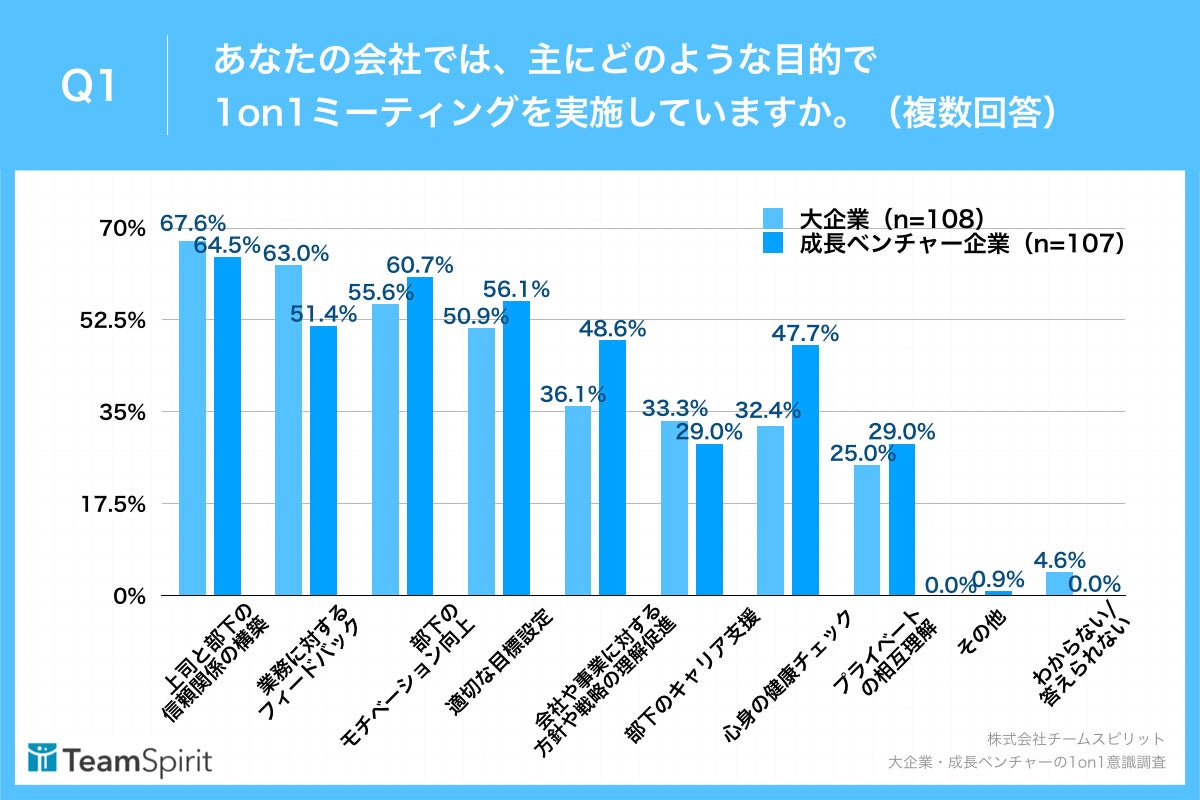 - ①1on1ミーティングの主な目的は、大企業・成長ベンチャーのどちらも「上司と部下の信頼関係の構築」が6割以上で最多