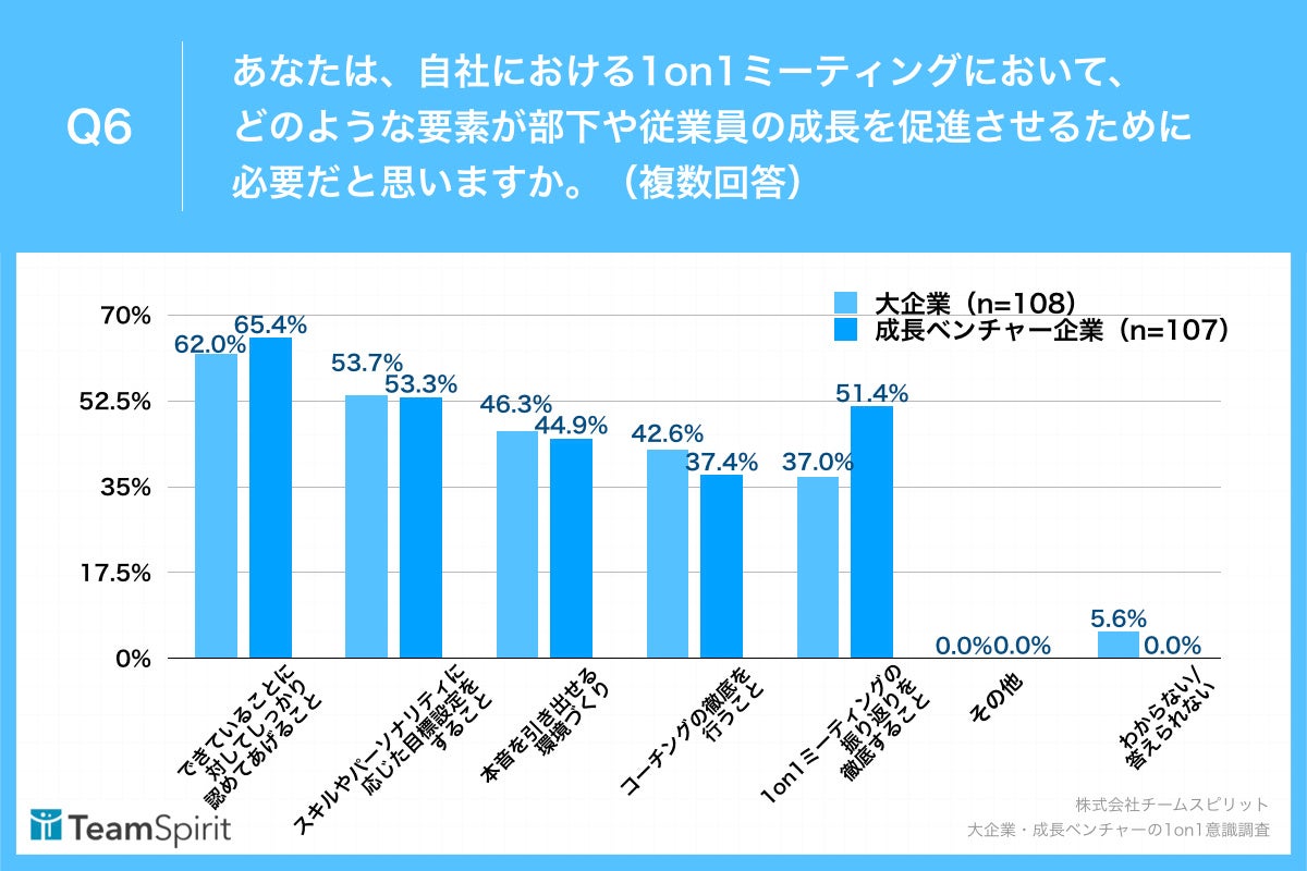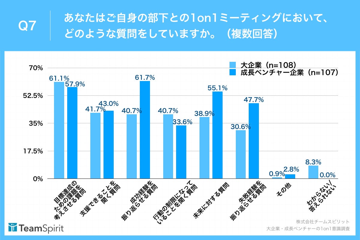 - ⑦1on1で投げかける質問、成長ベンチャーは「成功経験を振り返らせる質問」が最多、一方で大企業は「目標達成のための課題を考えさせる質問」が最多