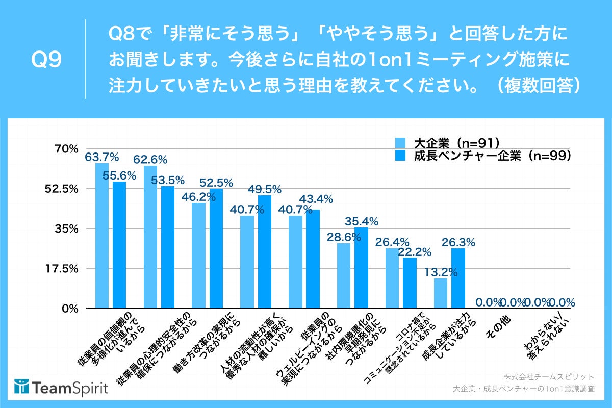 - ⑧ベンチャー企業の92.5%が「今後1on1を強化していきたい」と回答、一方の大企業はベンチャー企業より8.3ポイント低い結果に
