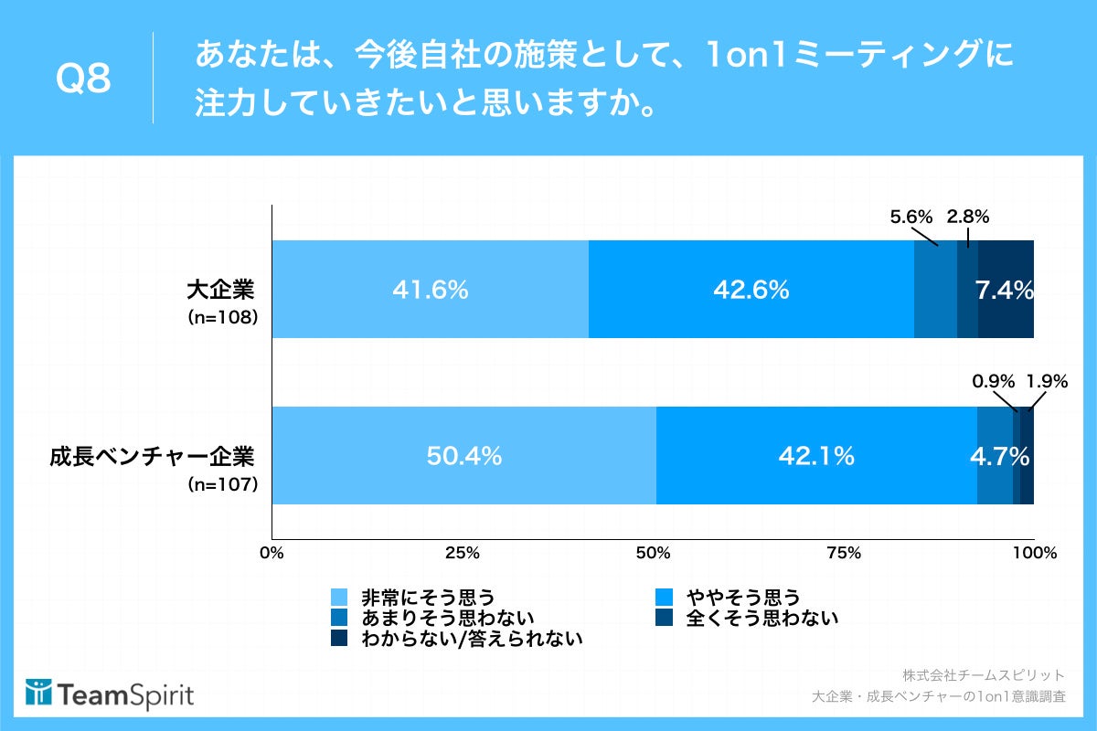 今後は、ベンチャー企業の92.5%が「従業員の価値観の多様化が進んでいることや従業員の心理的安全性の確保のため、さらに1on1を強化していきたい」と回答しており、一方の大企業はベンチャー企業より8.3ポイント低い結果となりました。