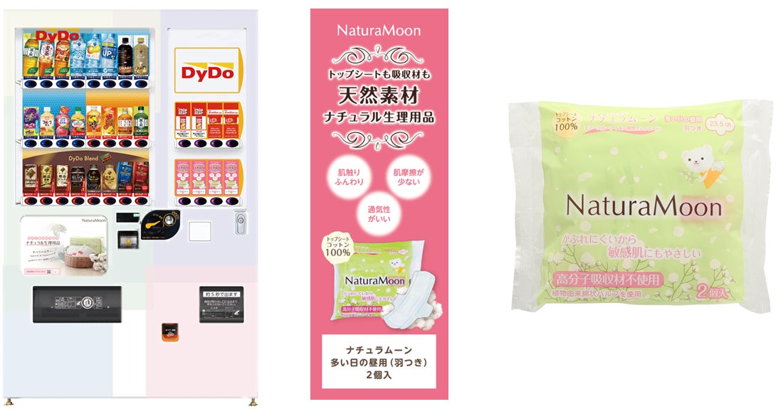「女性ヘルスケア応援自動販売機」は、飲料と女性用衛生用品(生理用ナプキン ※2枚入り)を購入することができる自販機です。飲料は、ダイドードリンコのお茶・紅茶飲料、水、スポーツドリンク類、果実野菜飲料などを販売し、生理用ナプキンはG-Placeの「ナチュラムーン 多い日の昼用(羽つき)2枚入り」(販売価格:税込160円)を販売します。