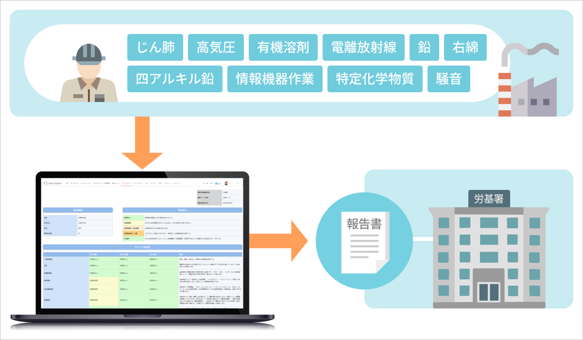 有機溶剤や特定化学物質など、10種類の特殊健診のデータ管理と労基署報告用集計が可能に