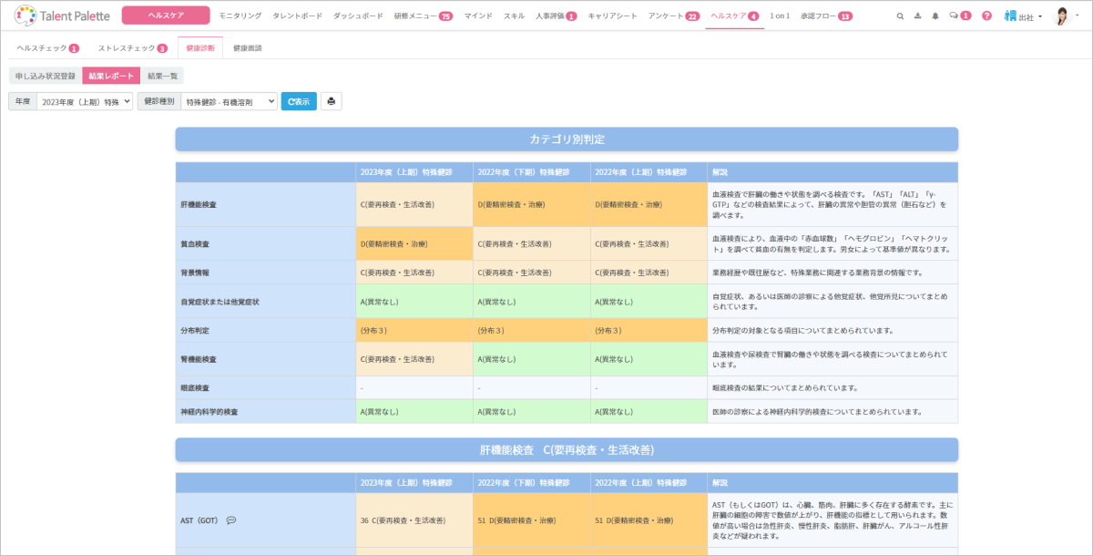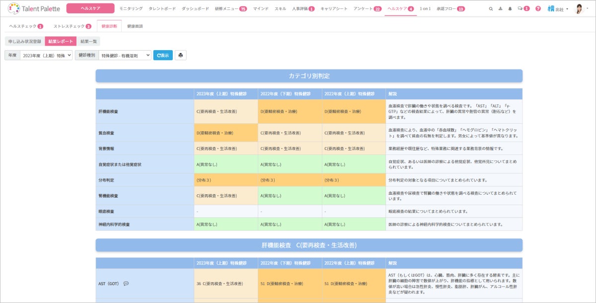 タレントパレットのヘルスケア管理オプションでは、厚労省が公開している特定健診項目をベースとした147個の一般健診用の健診項目を自動作成し、日本人間ドック学会による判定基準もデフォルトでセットされ、社員の経年での健診状態が健診機関に関わらず共通基準で可視化できますが、今回の特殊健診対応により、「じん肺」、「有機溶剤」、「鉛」、「四アルキル鉛」、「特定化学物質」、「高気圧」、「電離放射線」、「石綿」、「情報機器作業」、「騒音」の10種類の特殊健診該当業務に関しても、各健診に対応した健診項目および判定基準が自動作成できるようになりました。