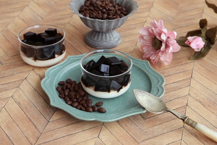 すっきりとした苦みのコーヒーゼリーにアマレット香るパンナコッタを合わせました。