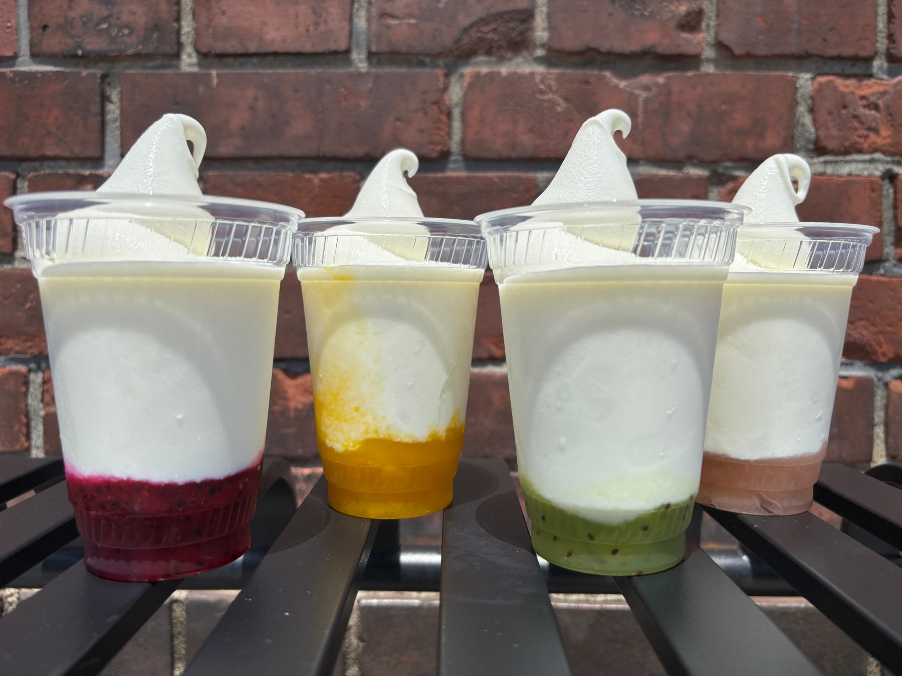 キウイやドラゴンフルーツなどの4種類の果肉入りソースを加えた、さっぱりとしたヨーグルトスムージーに牛乳ソフトクリームを合わせました。