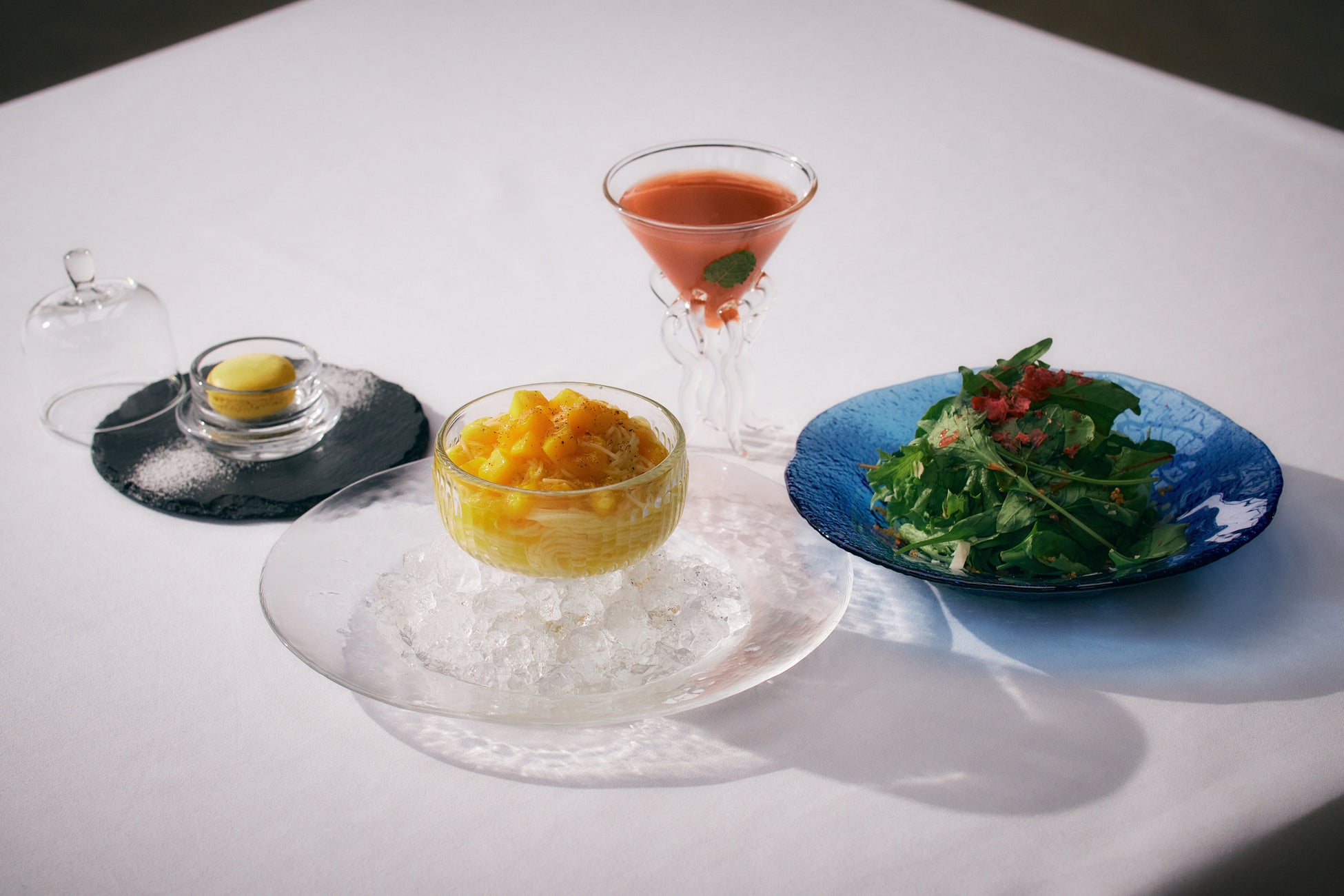 真夏にぴったりの体を冷却させる爽快なパスタランチセット。Welcome Moctailには夏スイカとバジルのモクテル、お花を使ったグリーンサラダには南国フルーツソースを使用。美容や健康にも嬉しいキヌアとアーモンドを添えてご用意いたしました。メインのパスタは冷却したマンゴーの冷製カッペリーネ。デザートマカロンもついたお得なランチセットです。