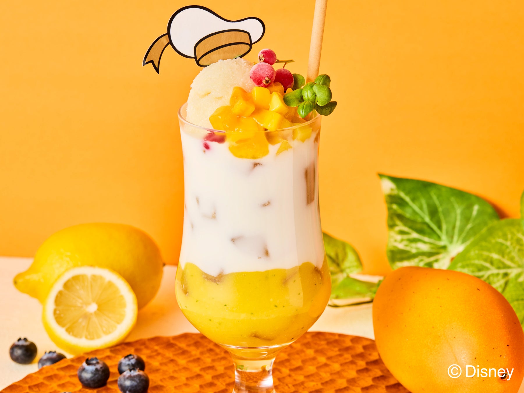 ドナルドダックをイメージしたマンゴーピューレとヨーグルトでラッシー風に仕上げたドリンクにフローズン甘酒をトッピングしたフロートドリンク。