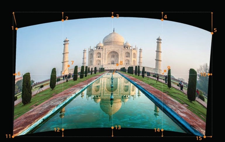 縦は上端、中央、下端の3列、横5列の計15か所のポイントの歪み補正が可能。壁面の凹凸や角度等によって、投影が歪んでしまう場合でも安定した形状で映像が表示できます。