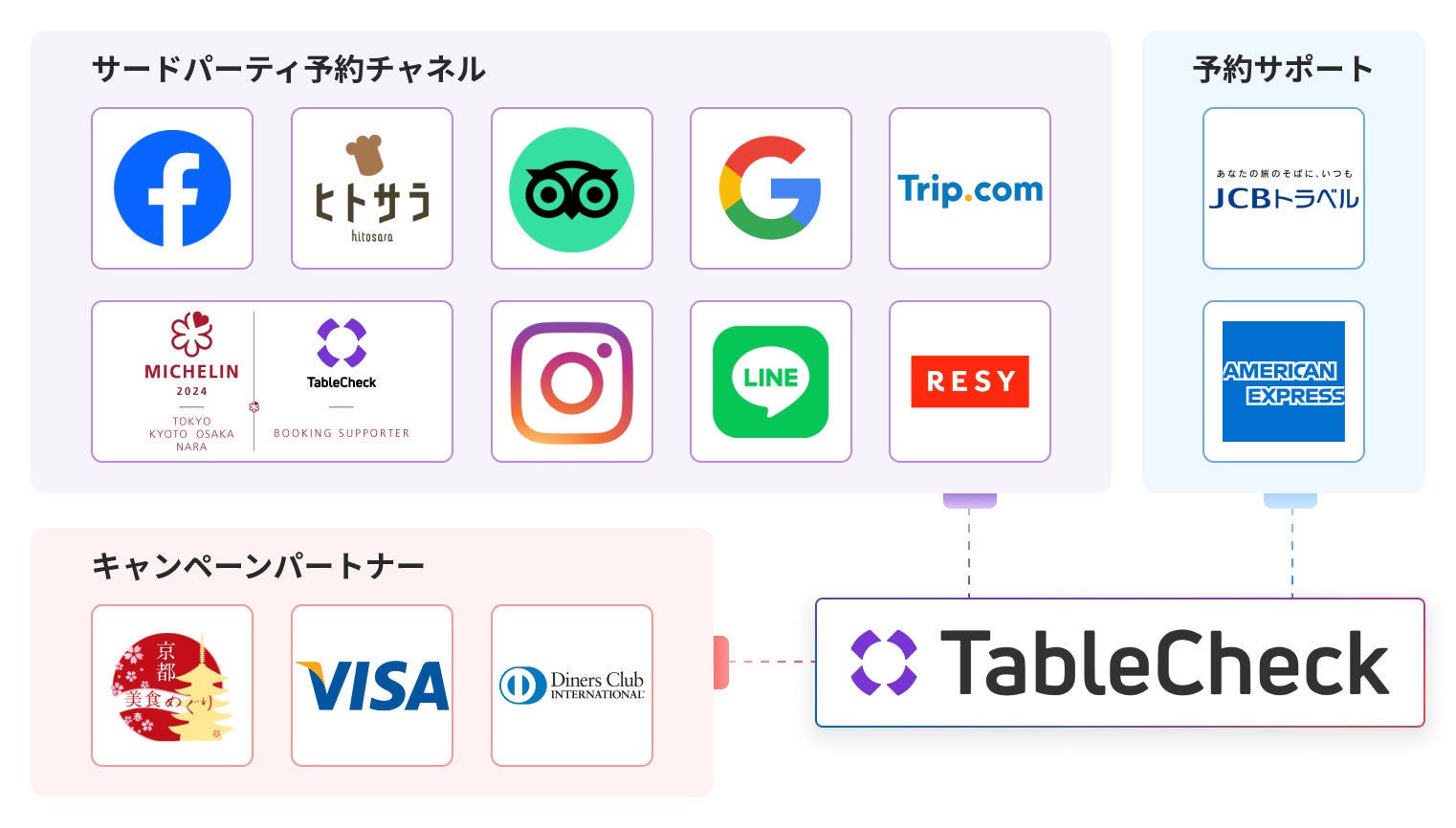テーブルチェックは、国内外のパートナー企業を通じて、世界中の優良なゲストを飲食店に送客する仕組み「TableCheck Channels」を構築してきました。ミシュランガイドやトリップアドバイザーとの公式連携をはじめ、国際的なクレジットカードブランドとの共催キャンペーンやイベントへの協賛などを通じて、多くの訪日ゲストを日本の飲食店に送客してきました。