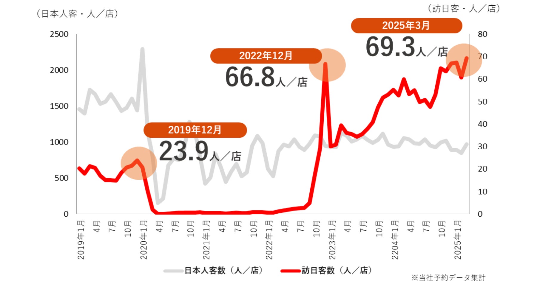 テーブルチェックの予約データでは、すでに訪日客の予約件数は2019年比で約3倍にまで増加し、2025年3月、訪日ゲストの予約人数は過去最高を記録しました。
