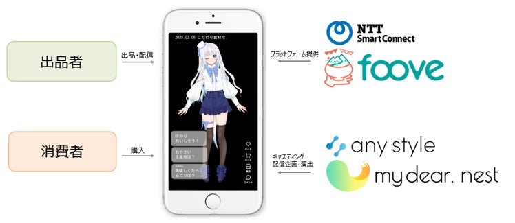 この度、採択をした3社の中から株式会社any style(代表取締役CEO:萩原湧人、以下、any style)とVtuberを起用したライブコマースの実証配信を実施することとなりました。第1回目として2025年2月6日にNTTスマートコネクトが提供する食のライブコマースプラットフォーム「foove」内にて実証実験を行います。