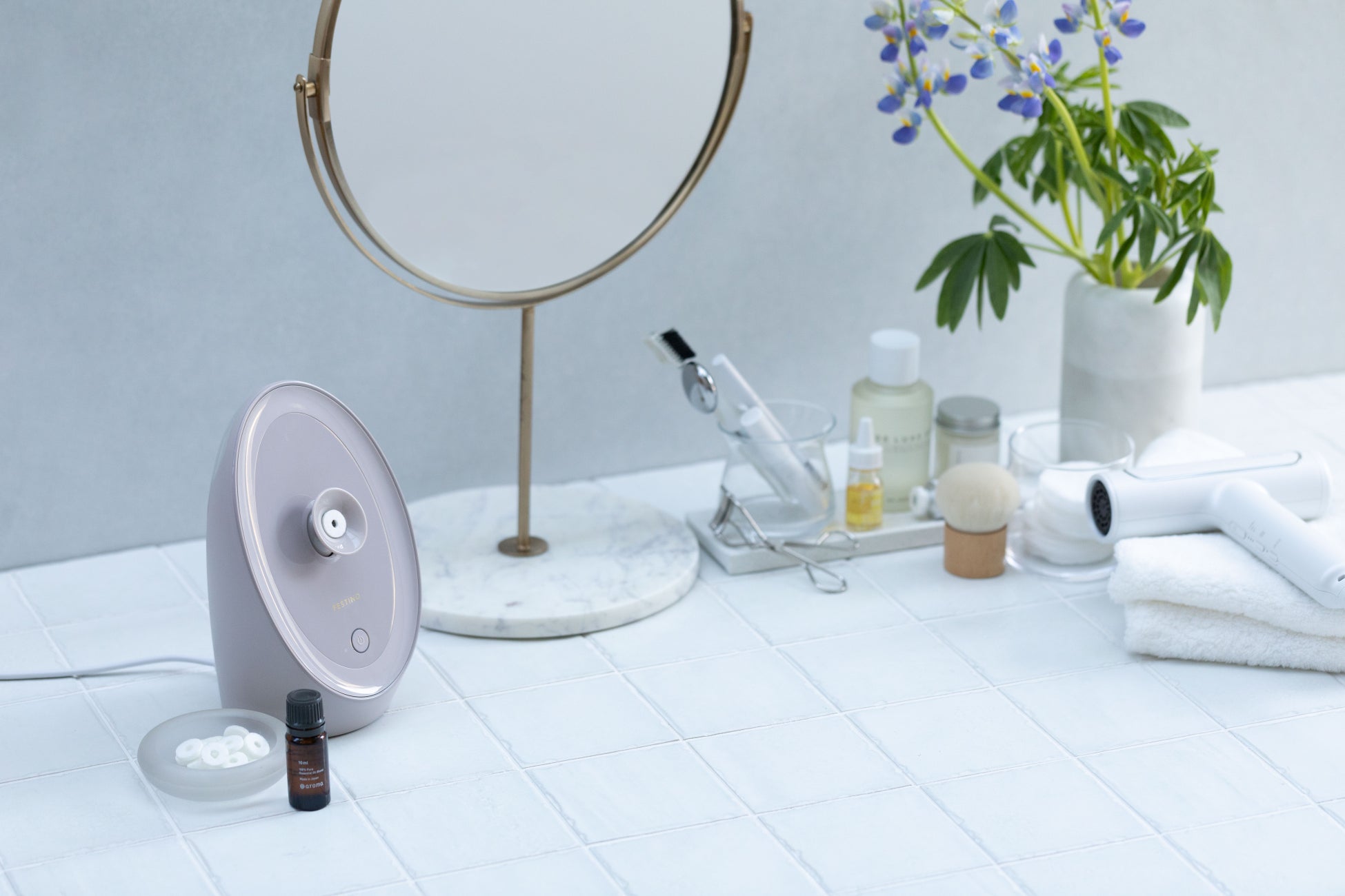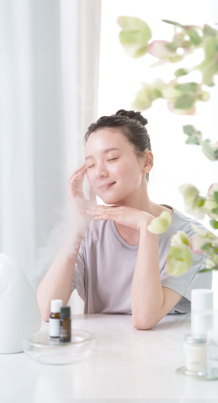 付属のアロマパッドにお好みのエッセンシャルオイルを含ませてセットすれば、ミストと一緒に香りが広がります。朝のスキンケアで肌が目覚め、夜は1日の疲れが癒やされます。