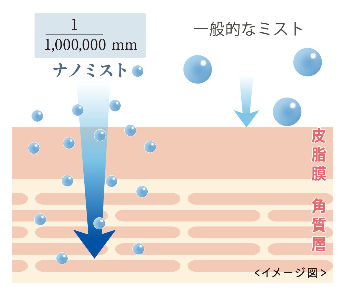 一般的なサイズのミストが肌表面にとどまるのに対し、粒子の細かいナノサイズミストは角質層まで行き渡ります。