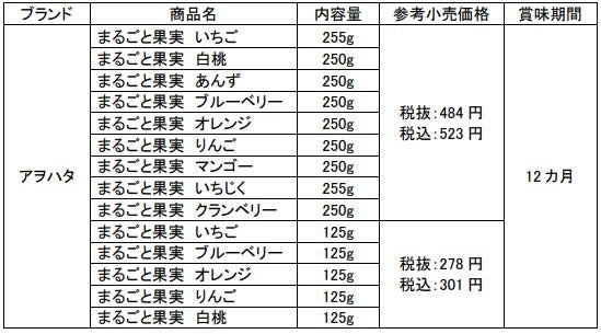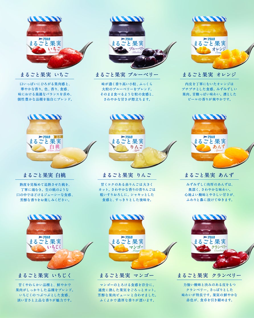 「アヲハタ まるごと果実」は、“ごろりとした果肉”“さわやかでフルーティーな香り”“くだものそのものを食べるような、みずみずしさ”が特徴のフルーツスプレッドです。果実と果汁だけのおいしさをとことん追求しており、フルーツを手軽に味わえる商品です。
