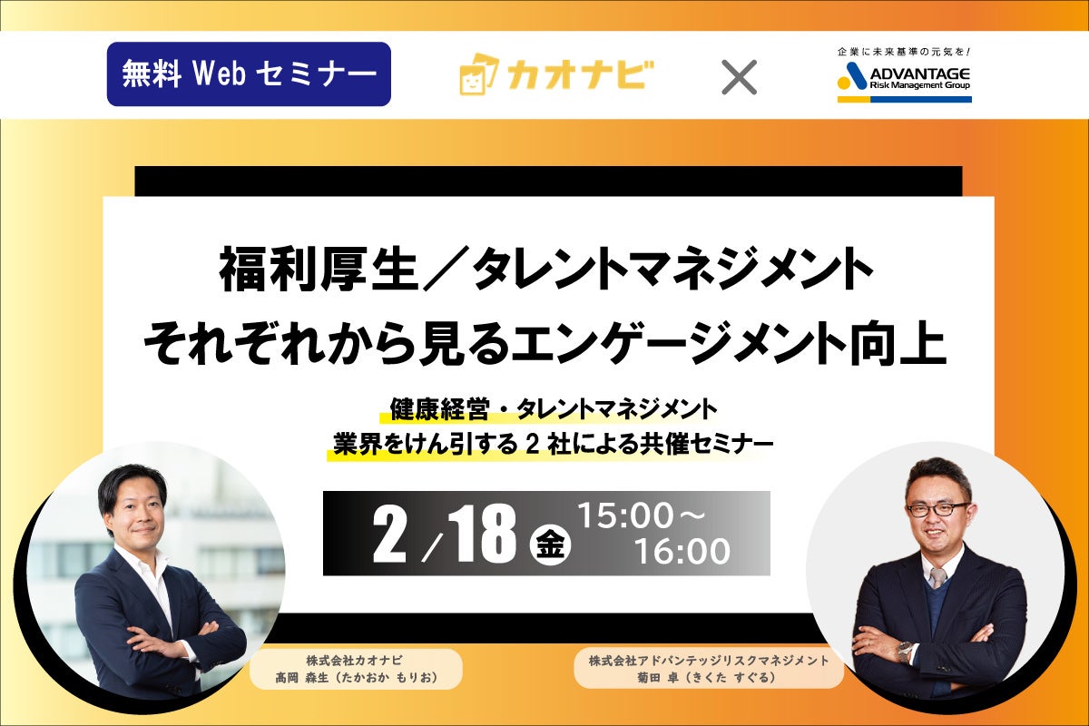 このたび、社員の個性・才能を発掘し戦略人事を加速させるタレントマネジメントシステム「カオナビ」を展開する株式会社カオナビと、健康経営にも繋がり、採用強化や人材定着に必要不可欠な福利厚生サービス「アドバンテッジWellGage(ウェルゲージ)」を展開する当社アドバンテッジリスクマネジメントの共催セミナーを開催するはこびとなりました。