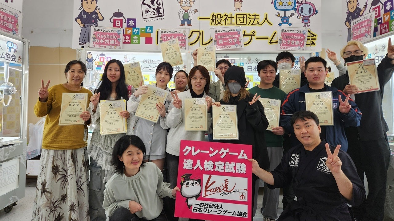 2025年5月に開催された第1回公式外国人限定「くれ達3級」では、雨天にもかかわらず定員を上回る12名の訪日外国人が参加し、すべての受講者が合格。多言語対応の資料・看板、通訳スタッフのサポートのもと、五十嵐講師とインフルエンサーMiraiMiraiP氏による実演講習が行われ、全員が実際に景品を獲得するなど、笑顔と達成感に包まれたイベントとなりました。