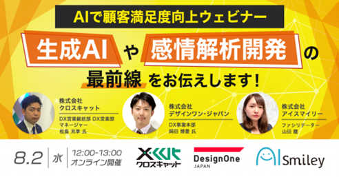 株式会社クロスキャット(本社:東京都港区、代表取締役社長:山根光則、以下クロスキャット)は、国内最大級のAIポータルメディアを運営する株式会社アイスマイリーが8月2日(水)12時より開催する「AIで顧客満足度向上ウェビナー ~生成AIや感情解析開発の最前線~」に、当社社員が登壇することをお知らせいたします。クロスキャットは、音声感情解析AIを活用して社員一人一人のメンタルヘルスケアを実現するソリューションなど、健康経営推進の支援によって顧客満足度を向上した事例などについてご紹介します。