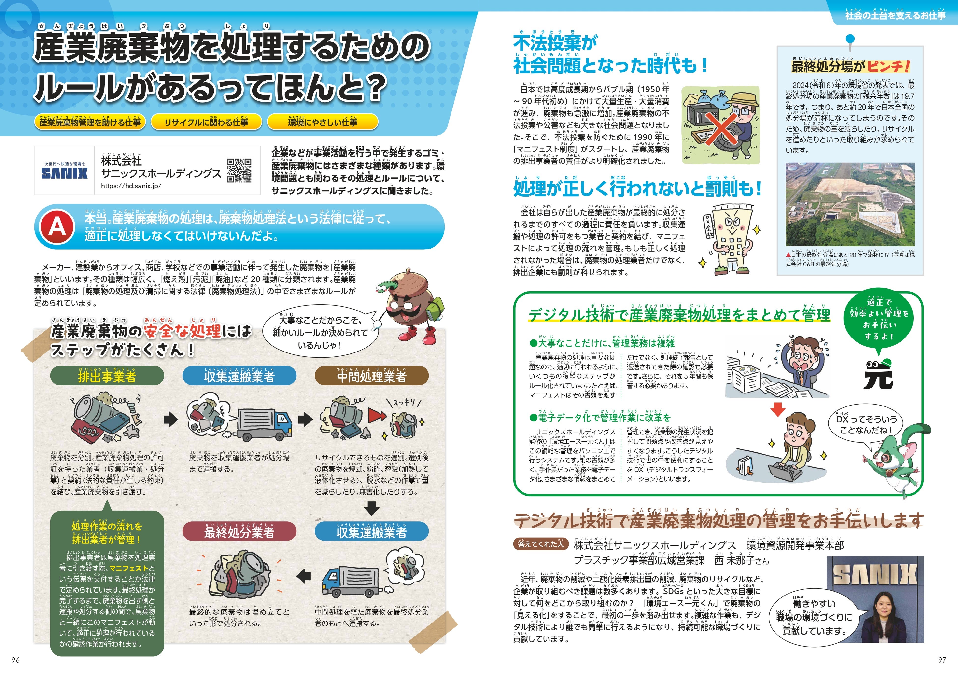 当社は、1994年に産業廃棄物処理業に進出して以来、廃プラスチックの燃料化や廃液の浄化事業等、環境保全に関する事業を展開しています。今回、『おしごと年鑑2025』 では、「産業廃棄物を処理するためのルールがあるってほんと?」をテーマに、産業廃棄物の回収から運搬、中間処理、最終処分までの流れを紹介しました。また、厳しいルールが設けられるようになった背景等についても解説しており、子どもたちが環境を守るためのルールとその大切さを学ぶきっかけになればと考えています。
